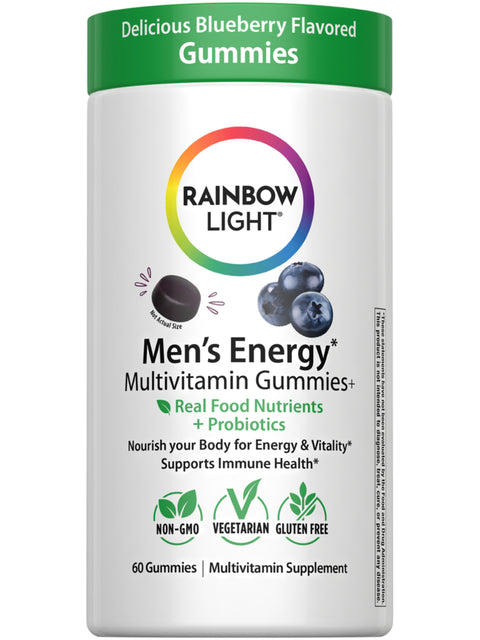 Boost your daily wellness with Rainbow Light® Men’s Energy Multivitamin Gummies.* Our formula provides a delicious and convenient way to support men’s energy, vitality, and overall health.* These vegetarian blueberry flavored gummies are packed with vitamins, minerals, nutrients, and probiotics.