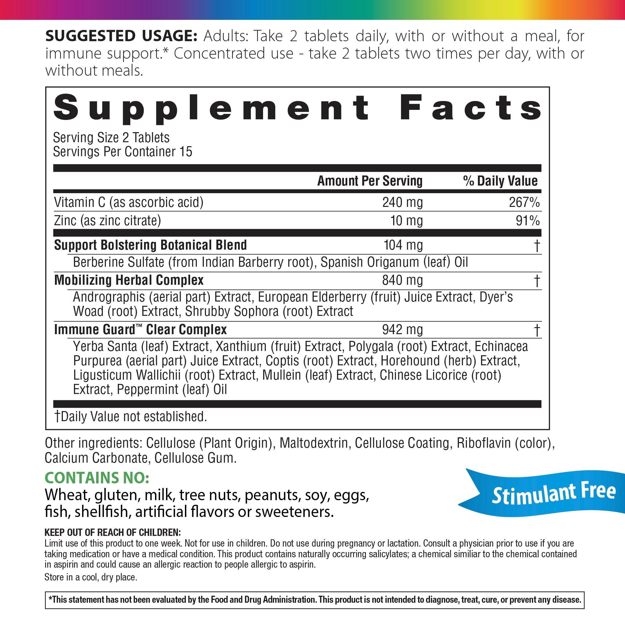Cada porção é formulada para incluir 942 mg do nosso Complexo Clear do Immune Guard™, uma mistura herbal com extratos de Erva Santa, Xantio, Polígala, Equinácea Purpurea, Coptis, Marrubio, Ligusticum Wallichii, Verbascum, e Alcaçuz Chinês, além de Óleo de Hortelã-pimenta. Esta ampla mistura de botânicos proporciona suporte tradicional para complementar a Vitamina C e o Zinco, juntamente com a herança baseada em plantas e a abordagem holística da fórmula.